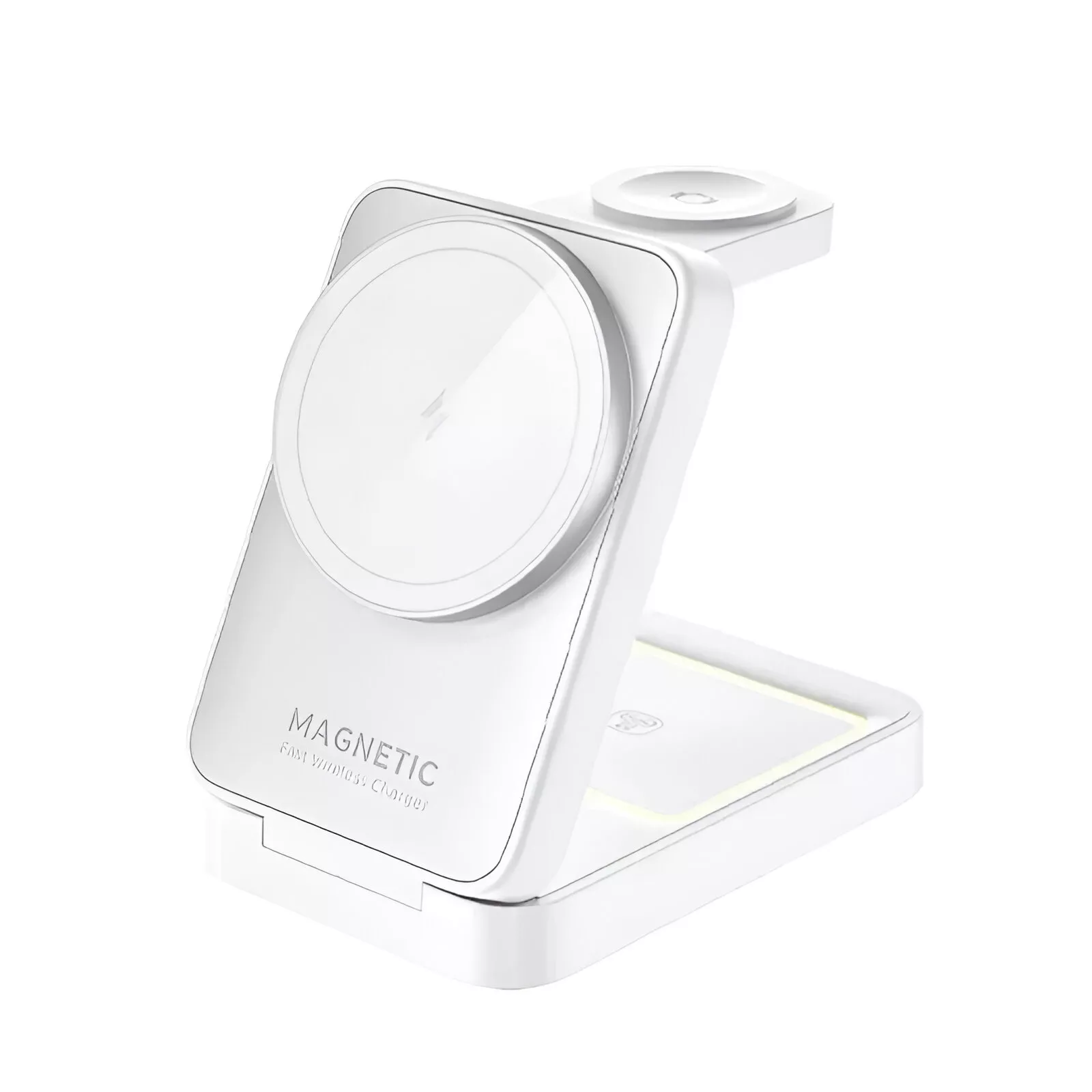 Simplify your daily charging routine with this sleek, compact, and powerful 3-in-1 Magnetic Wireless Charger Stand. Designed specifically for Apple lovers, this foldable wireless charging station powers up your iPhone, Apple Watch, and AirPods all at once—no more tangled cables or cluttered desks. Whether you’re at home, in the office, or on the go, this device brings order and efficiency to your digital life. Compatible with iPhone 15/14/13/12 series and more, Apple Watch Series 2-8/Ultra/SE, and AirPods Pro/3/2 with wireless charging cases, it’s your ultimate all-in-one charging solution.