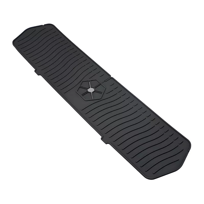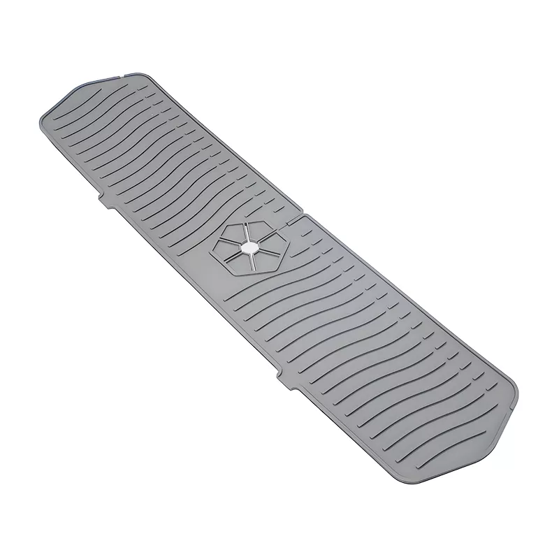 This modern-style rectangular mat is crafted from high-quality, food-grade silicone that is both soft and durable. It features a gently raised edge to guide water back into the sink, while the slip-resistant design helps it stay in place. The extended 30-inch length offers full coverage behind the faucet, making it ideal for larger or double sinks.