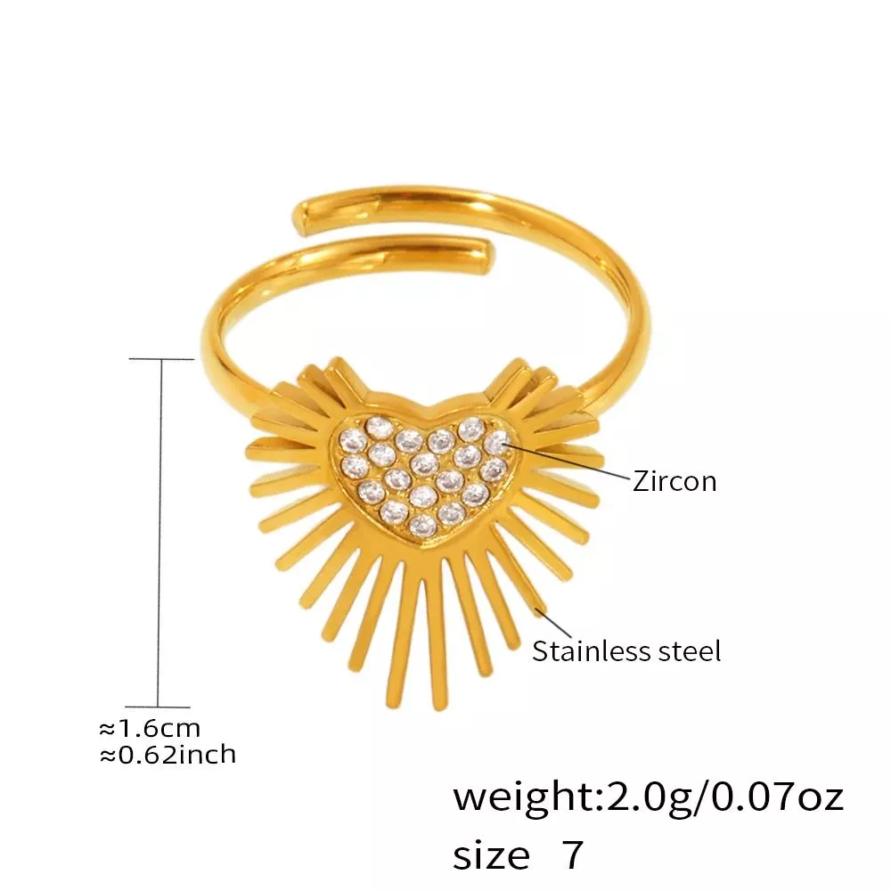 Discover the timeless beauty and elegance of this stunning adjustable ring designed for the modern woman. Crafted from premium stainless steel and plated with luxurious 18k gold, this exquisite piece is designed to shine. Featuring a dazzling inlay of shiny zircons, the Women’s Radial Heart Ring is a perfect addition to your jewelry collection. Whether you’re dressing up for a special occasion or adding a touch of sophistication to your everyday style, this ring is the perfect accessory.