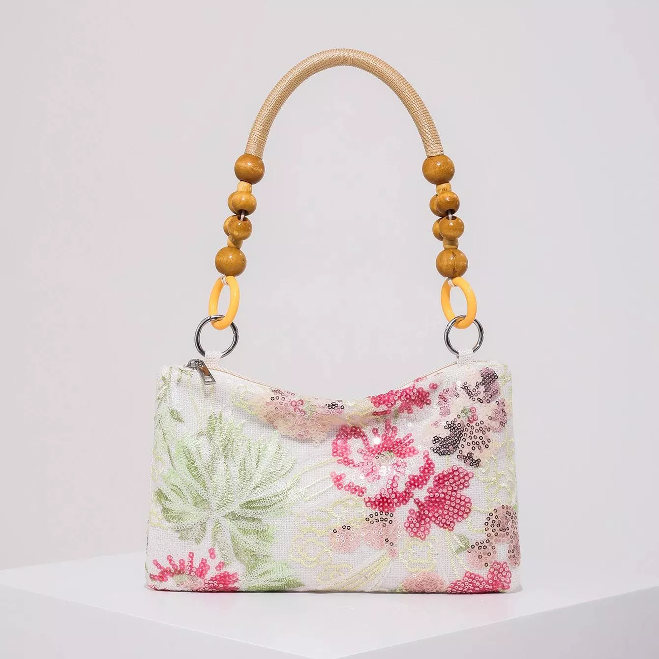 Floral Beaded Sequin Woven Wooden Handle Shoulder Bag for Women