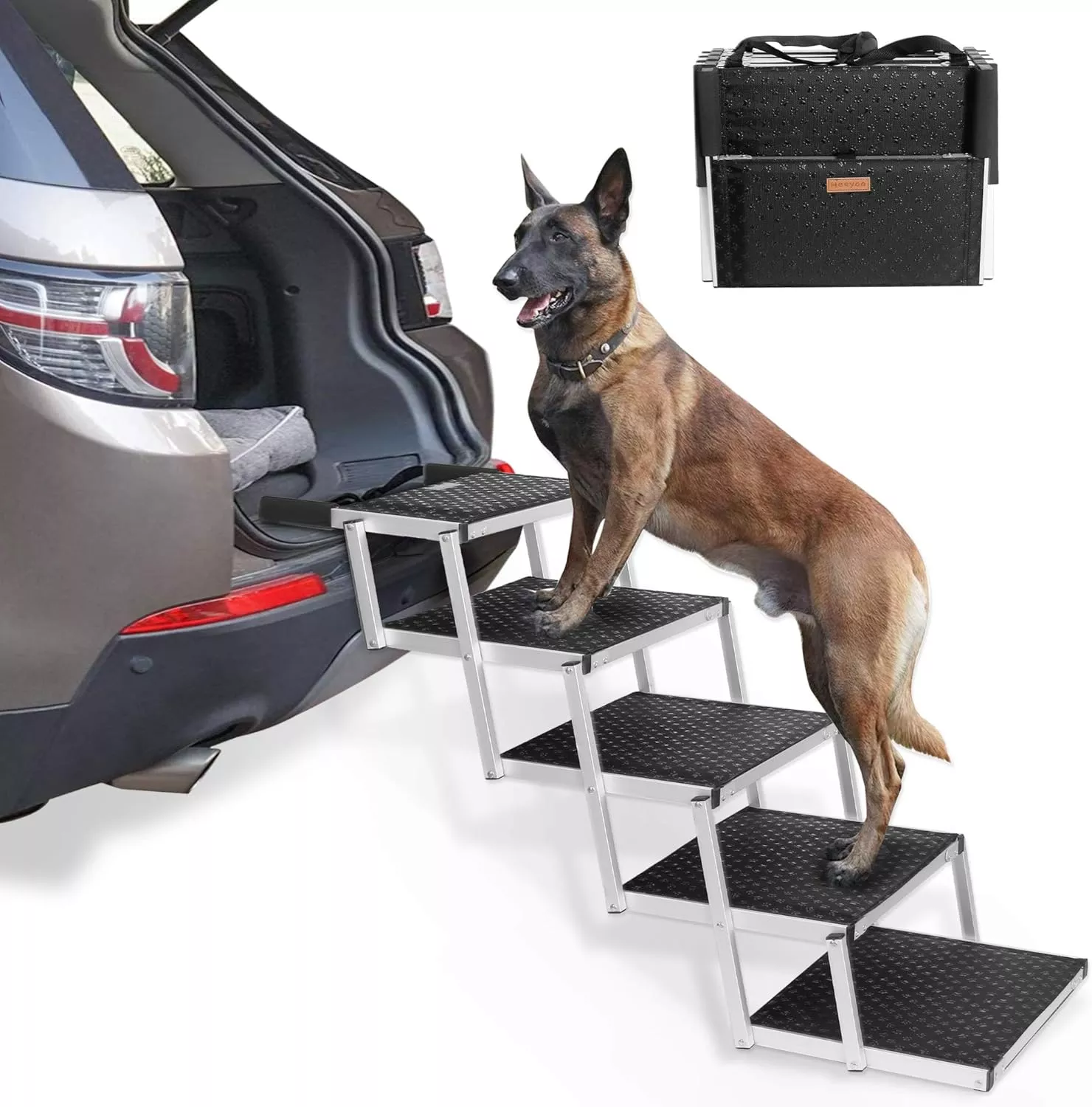 Help your furry friend climb in and out of your SUV, car, or truck with ease using this folding aluminum dog car ladder. Designed for outdoor use, this pet step ladder is perfect for active dogs who love road trips, outdoor adventures, or simply hopping in for a ride. With its sturdy aluminum alloy frame and durable 1680D PVC Oxford fabric, it’s built to handle your dog’s weight while staying lightweight for you to carry. Whether you’re heading to the park, beach, or vet, this ladder makes every trip safer and more comfortable for your pet.