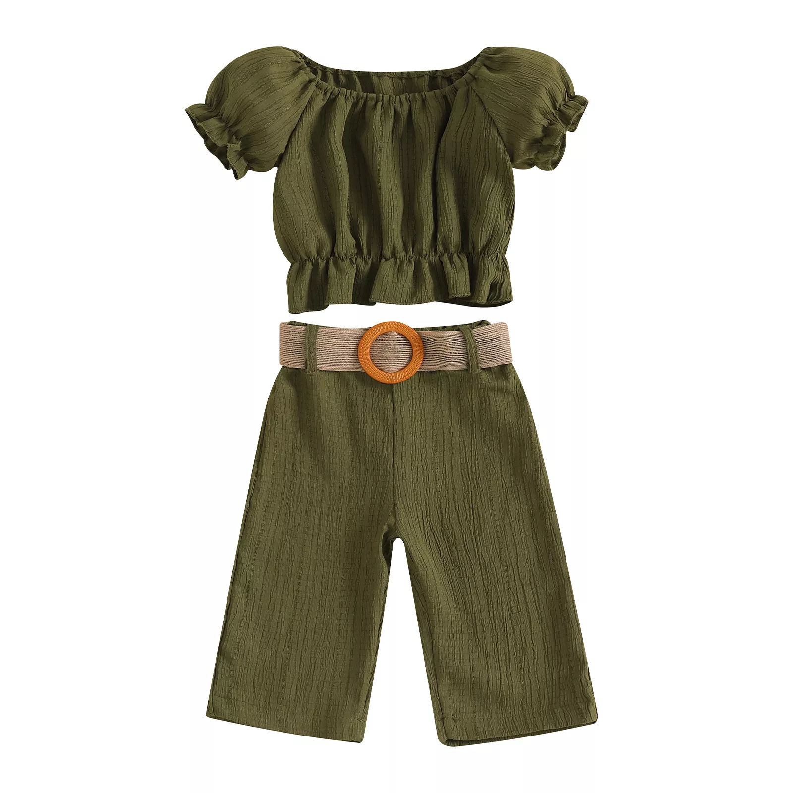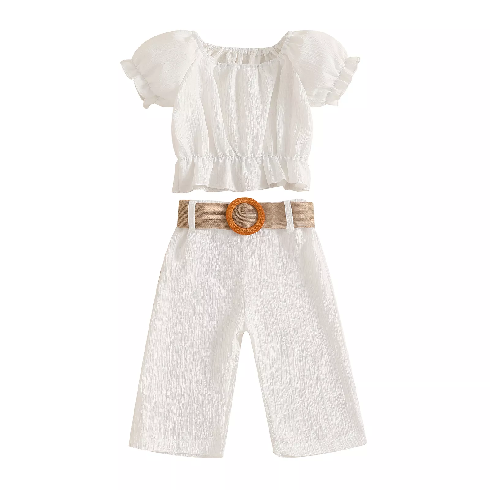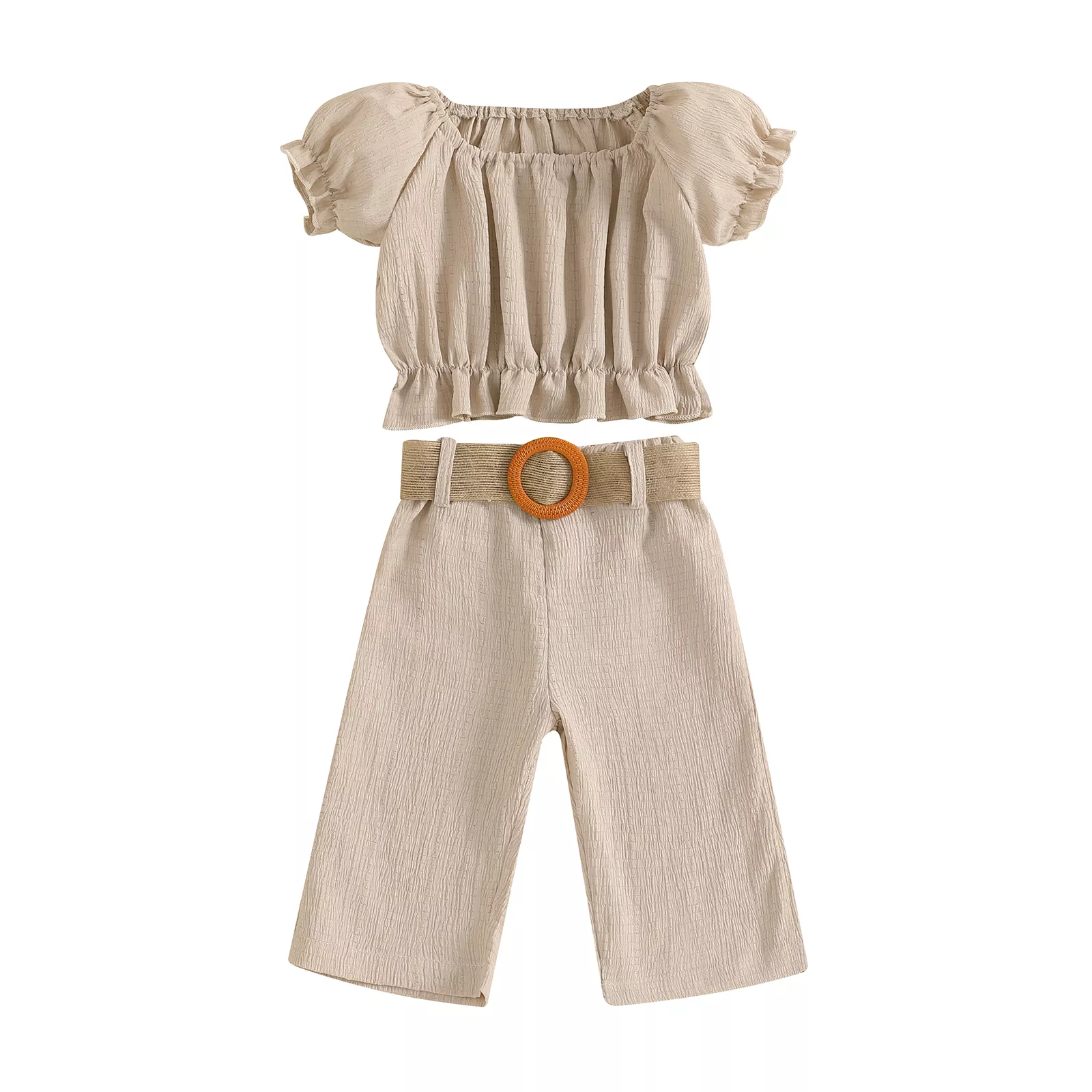 Make your little one shine with this charming two-piece summer outfit. Designed for toddler and infant girls, this set includes a soft ruffled short sleeve T-shirt and matching stretch pants with a cute belt. The solid color design makes it easy to mix and match, while the thoughtful details make it a standout choice for sunny days. Whether you’re dressing up for a birthday party, a family outing, or just a casual day at the park, this outfit delivers the perfect mix of comfort and style.